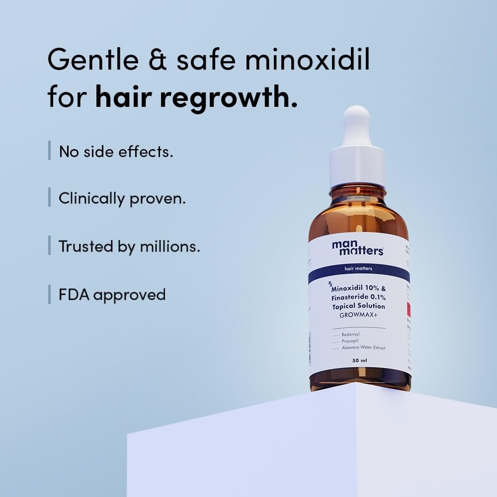 For advanced hair fall control and stronger regrowth support, Man Matters Growmax+ combines 10% Minoxidil with 0.1% Finasteride in a powerful topical solution designed for men facing aggressive hair thinning and pattern hair loss. This high-strength formula targets hair follicles directly to support thicker, denser hair growth with consistent use.