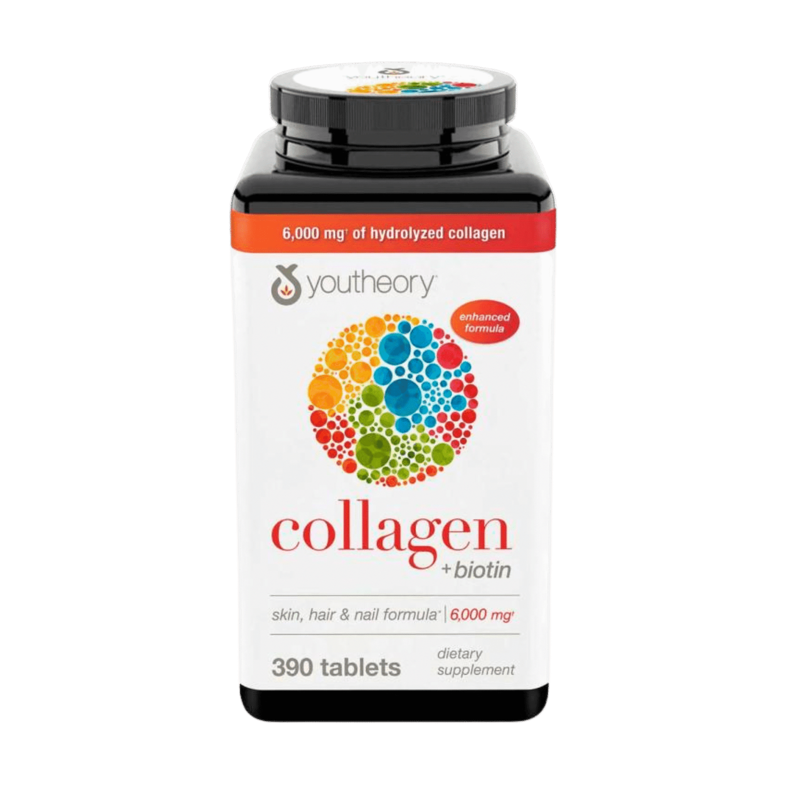 Youtheory Collagen Plus Biotin – 390 Tablets, featuring 0.6 grams of Collagen Types 1, 2, and 3, along with 18 amino acids. This supplement is designed to support skin, hair, and nails with an added 60 mg of Vitamin C. Collagen is the most abundant protein in the human body and plays an essential role in the structure of skin, joints, bones, blood vessels, organs, and more. The term “collagen” is derived from the Greek word “kolla,” which means glue, highlighting its role as the substance that holds us together.